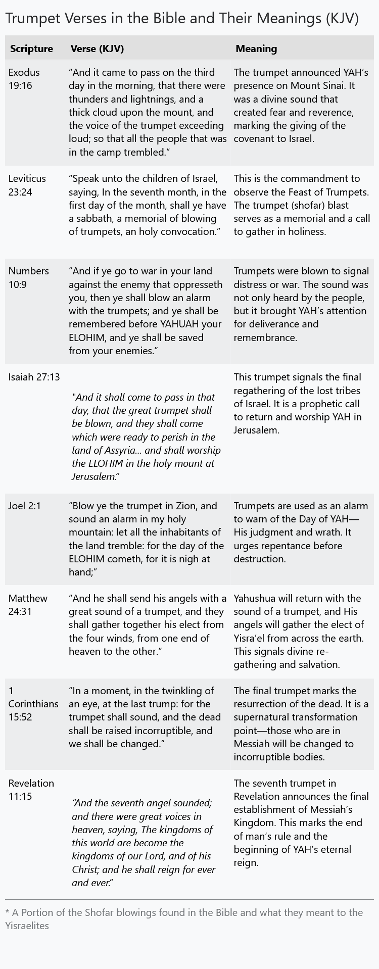 The Feast of Trumpets, also called Yom Teruah, is a biblical Holy Day commanded in Leviticus 23:23–25. It is a day of “blowing of trumpets”—a time to sound the alarm, awaken the people of YAH, and prepare hearts for the judgment and return of the Messiah.